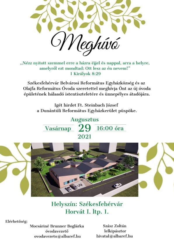„Nagyszerű esemény városunk életében, hogy ezt az óvodát átadhatjuk, hiszen a legjobb befektetés a gyermekeink jövője. Magyarország Kormányának 620 millió forintos támogatásából, valamint a fehérvári reformátusok 20 millió forintos önerejéből valósulhatott meg ez a gyönyörű óvoda.” - hangsúlyozta Vargha Tamás, aki hozzátette: